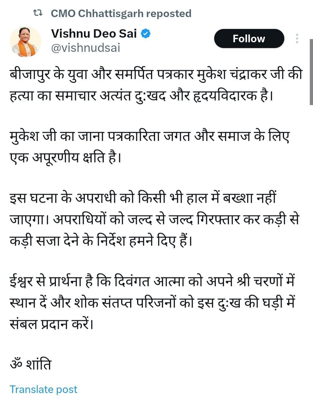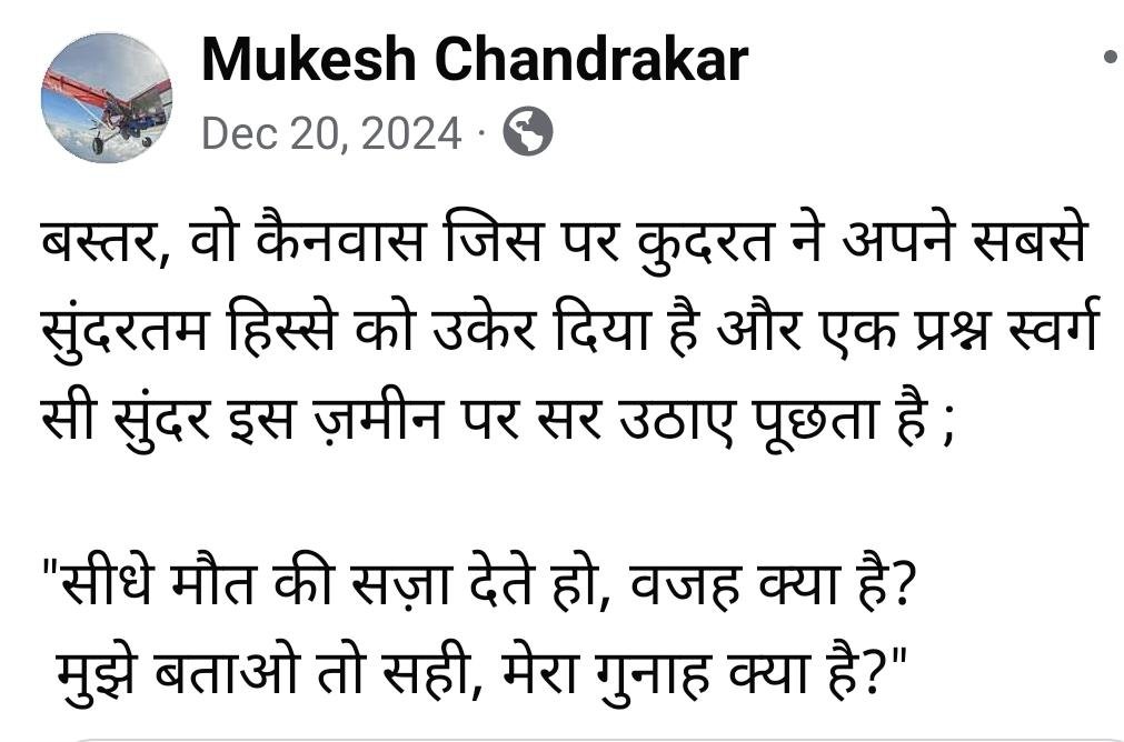 बस्तर आज दो मामलों में राज्य के साथ पूरे देश में आकर्षण का विषय है एक कवासी लखमा और उनके पुत्र की ई.डी में पूछताछ और पत्रकार मुकेश चंद्राकर की हत्या। दोनों ही मामले भष्ट्राचार से जुड़े हैं। भविष्य के गर्भ में बहुत कुछ छिपा है किसी की मौत या ?