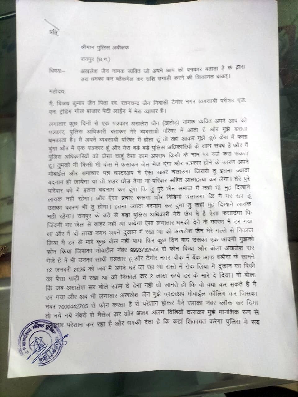 व्यवसायी के मुताबिक, खुद को पत्रकार बताने वाला एक व्यक्ति बार-बार उनके परिसर में घुसकर धमकाता रहा, खुद को पुलिस अधिकारियों का खास बताकर कहता रहा –