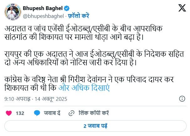 पूर्व मुख्यमंत्री भूपेश बघेल ने इस मामले को लेकर सोशल मीडिया पर तीखी प्रतिक्रिया दी। उन्होंने लिखा, “अदालत और जांच एजेंसी EOW/ACB के बीच आपराधिक सांठगांठ की शिकायत पर मामला अब आगे बढ़ा है। रायपुर की अदालत ने EOW/ACB के निदेशक सहित दो अन्य अधिकारियों को नोटिस जारी कर जवाब तलब किया है।” बघेल ने कहा कि कांग्रेस के वरिष्ठ नेता गिरीश देवांगन ने परिवाद दायर कर EOW/ACB की कार्यप्रणाली पर गंभीर सवाल उठाए हैं।