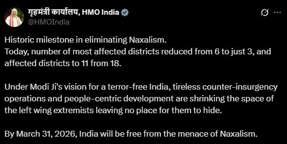 केंद्रीय गृह मंत्रालय के अनुसार, अब देश में नक्सली प्रभावित जिलों की संख्या 18 से घटकर 11 रह गई है। सबसे अधिक प्रभावित जिले अब केवल छत्तीसगढ़ का बीजापुर, सुकमा और नारायणपुर हैं। 31 मार्च 2026 तक भारत नक्सलवाद से मुक्त होने की दिशा में सरकार दृढ़ कदम उठा रही है।