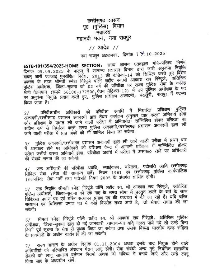 स्नेहा गिरपुंजे के पति, एएसपी आकाश राव गिरपुंजे, सुकमा में आईईडी विस्फोट में शहीद हुए थे। उनके बलिदान और सेवाभाव को ध्यान में रखते हुए राज्य सरकार ने अनुकंपा नियुक्ति का यह निर्णय लिया।