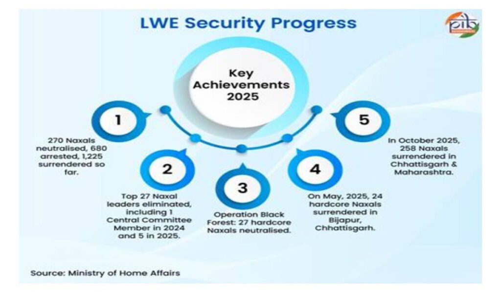 अकेले वर्ष 2025 में सुरक्षा बलों ने 270 नक्सल उग्रवादियों को मुठभेड़ में मार गिराया, 680 नक्सलियों को गिरफ्तार किया और करीब 1225 नक्सलियों को आत्मसमर्पण करने के लिए बाध्य किया। सुरक्षा बलों की तरफ से ऑपरेशन ब्लैक फॉरेस्ट जैसे अभियान और बीजापुर , छत्तीसगढ़ और महाराष्ट्र में नक्सलियों द्वारा बड़े पैमाने पर किये गए आत्मसमर्पण से नक्सल उग्रवादियों को जीवन की मुख्यधारा में शामिल होने की महती प्रेरणा मिली है।