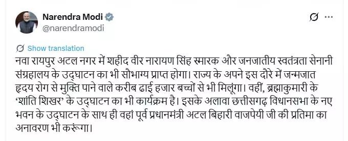 रायपुर पहुंचने के बाद प्रधानमंत्री मोदी सबसे पहले सत्य साईं हॉस्पिटल जाएंगे, जहां वे “दिल की बात” कार्यक्रम में शामिल होंगे।