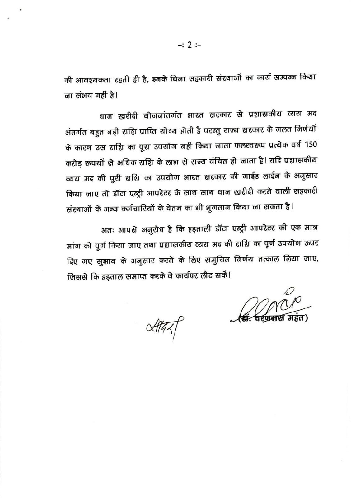 नेता प्रतिपक्ष डॉ. चरणदास महंत ने एक अन्य पत्र के माध्यम से कहा कि, धान खरीदी के कम्प्यूटरीकरण के कारण प्रत्येक केन्द्र में एक डॉटा एन्ट्री आपरेटर की नियुक्ति की जाती है। विगत वर्ष तक सभी डॉटा एन्ट्री आपरेटर को वर्ष के पूरे 12 माह का वेतन भुगतान किया जाता था परंतु 2025-26 में केवल छः माह का वेतन भुगतान विपणन संघ की निधि से किए जाने तथा इनकी नियुक्ति आउट सोर्सिंग के माध्यम से करने का निर्णय लिया गया है। इस निर्णय से क्षुब्ध होकर प्रदेश के समस्त डॉटा एन्ट्री आपरेटर हड़ताल पर चले गए हैं। उनकी मांग है कि पूरे 12 माह का वेतन दिया जाए तथा उनका नियमितिकरण किया जाए जो न्याय संगत है।