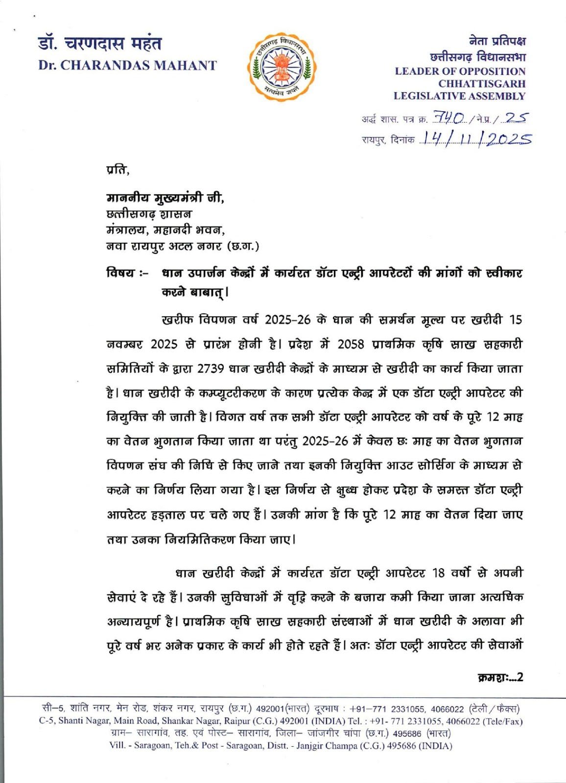 नेता प्रतिपक्ष डॉ. चरणदास महंत ने एक अन्य पत्र के माध्यम से कहा कि, धान खरीदी के कम्प्यूटरीकरण के कारण प्रत्येक केन्द्र में एक डॉटा एन्ट्री आपरेटर की नियुक्ति की जाती है। विगत वर्ष तक सभी डॉटा एन्ट्री आपरेटर को वर्ष के पूरे 12 माह का वेतन भुगतान किया जाता था परंतु 2025-26 में केवल छः माह का वेतन भुगतान विपणन संघ की निधि से किए जाने तथा इनकी नियुक्ति आउट सोर्सिंग के माध्यम से करने का निर्णय लिया गया है। इस निर्णय से क्षुब्ध होकर प्रदेश के समस्त डॉटा एन्ट्री आपरेटर हड़ताल पर चले गए हैं। उनकी मांग है कि पूरे 12 माह का वेतन दिया जाए तथा उनका नियमितिकरण किया जाए जो न्याय संगत है।