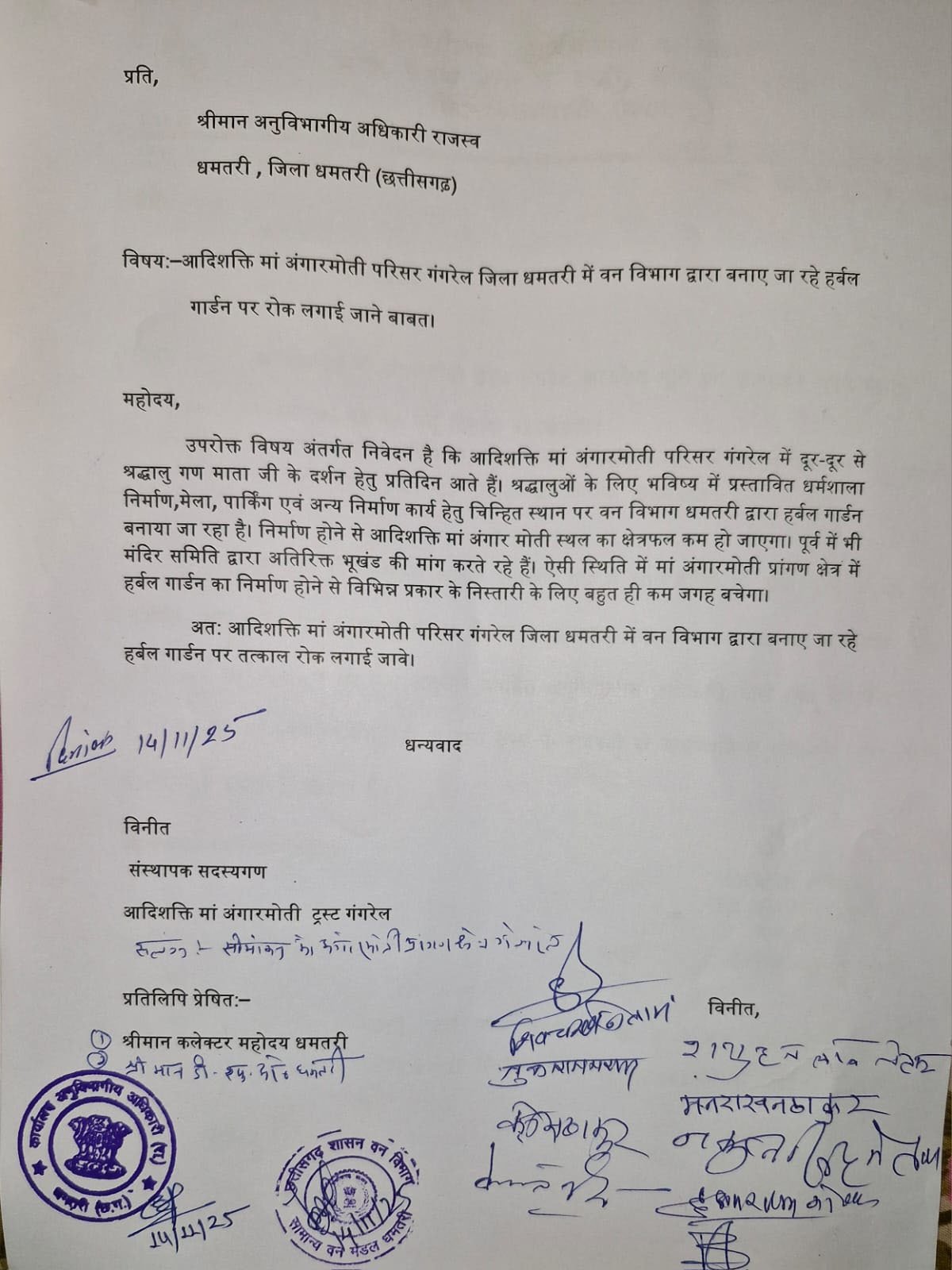 रायपुर : आदिशक्ति मां अंगारमोती परिसर गंगरेल जिला धमतरी में वन विभाग द्वारा बनाए जा रहे हर्बल गार्डन पर रोक लगाई जाने हेतु वन मंडलाधिकारी धमतरी, अनुविभागीय अधिकारी राजस्व धमतरी से भेंटकर ट्रस्ट के संस्थापक सदस्यों द्वारा ज्ञापन सौंपा गया।