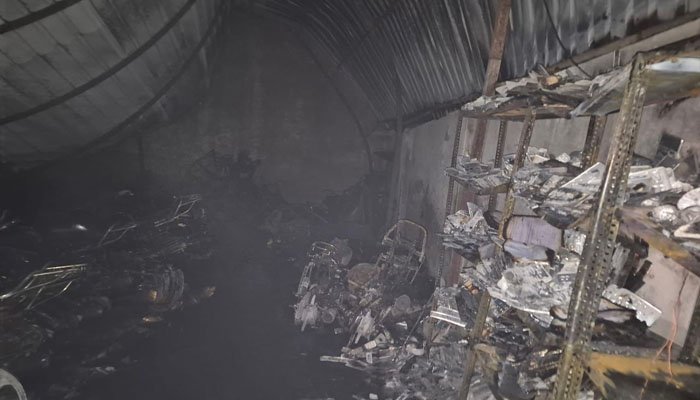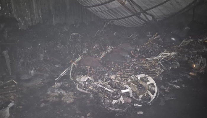 घटना में किसी के हताहत होने की सूचना नहीं है, हालांकि शोरूम को भारी नुकसान पहुंचा है। पुलिस और फायर विभाग मामले की जांच में जुटे हैं।