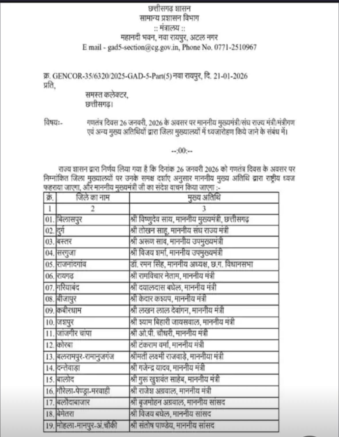 REPUBLIC DAY : मुख्यमंत्री विष्णु देव साय गणतंत्र दिवस के मौके पर बिलासपुर में झंडा फहराएंगे| तो वहीं, डिप्टी सीएम अरुण साव बस्तर और डिप्टी सीएम विजय शर्मा सरगुजा में झंडा फहराते हुए नजर आएंगे | दरअसल हर साल की तरह इस साल भी गणतंत्र दिवस के मौके पर 26 जनवरी को छत्तीसगढ़ के सभी जिला मुख्यालयों में विभिन्न प्रकार के कार्यक्रम का आयोजन किया जाएगा| इस कार्यक्रम को लेकर छत्तीसगढ़ सरकार की ओर से अतिथियों की लिस्ट जारी कर दी गई है|