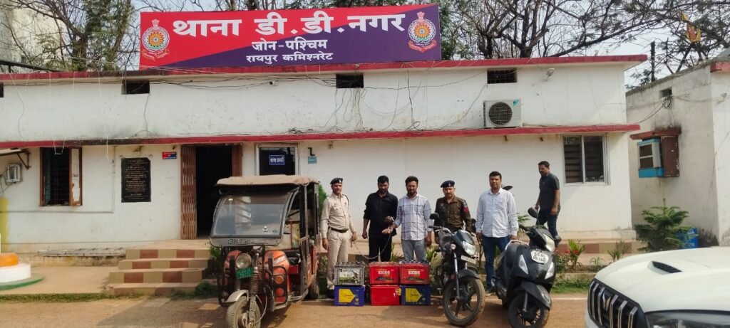 रायपुर। शहर में ई-रिक्शा और उसकी बैटरियों की चोरी करने वाले गिरोह का पुलिस ने पर्दाफाश किया है। एण्टी क्राइम एंड साइबर यूनिट तथा थाना डी.डी.नगर और आज़ाद चौक पुलिस की संयुक्त कार्रवाई में 02 अंतर्राज्यीय आरोपियों सहित कुल 05 आरोपियों को गिरफ्तार किया गया है। पुलिस ने 02 ई-रिक्शा, 40 बैटरियां और 02 दोपहिया वाहन जब्त किए हैं, जिनकी अनुमानित कीमत ₹8.55 लाख बताई गई है।