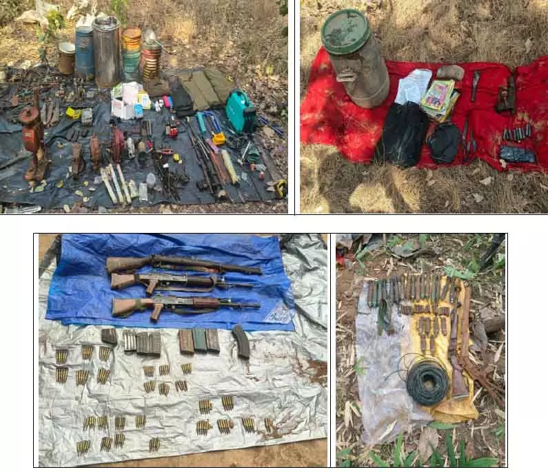 जानकारी के आधार पर जिला मुख्यालय गरियाबंद से ई-30 पुलिस टीम को 6 फरवरी 2026 को कार्रवाई के लिए रवाना किया गया। लगातार 36 घंटे चले सर्च अभियान में टीम ने छह अलग-अलग स्थानों से 2 इंसास, 1 303 राइफल, 1 देशी कट्टा, 1 सुरका (देशी बीजीएल लॉन्चर), 2 12 बोर, 2 सिंगल शॉट हथियार, 127 जिंदा राउंड, 8 मैग्जीन, 22 बीजीएल सेल, 1 बंडल इलेक्ट्रिक वायर और टेक्निकल टीम के विभिन्न वर्कशॉप उपकरण बरामद किए।