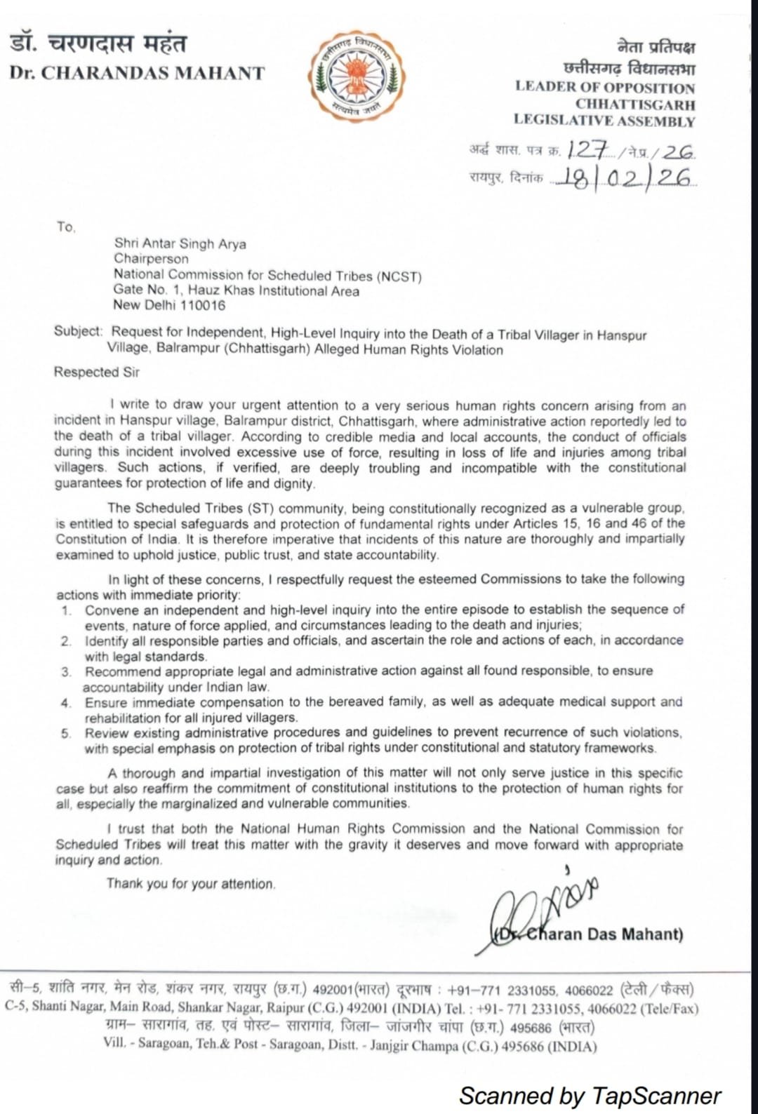 रायपुर, 18 फरवरी 2026। छत्तीसगढ़ विधानसभा नेता प्रतिपक्ष डॉ. चरणदास महंत ने छत्तीसगढ़ बलरामपुर जिले के हंसपुर गांव में एक आदिवासी ग्रामीण की मृत्यु की जाँच को लेकर राष्ट्रीय मानवाधिकार आयोग एवं राष्ट्रीय अनुसूचित जनजाति आयोग को पत्र लिखकर जाँच की मांग की है।