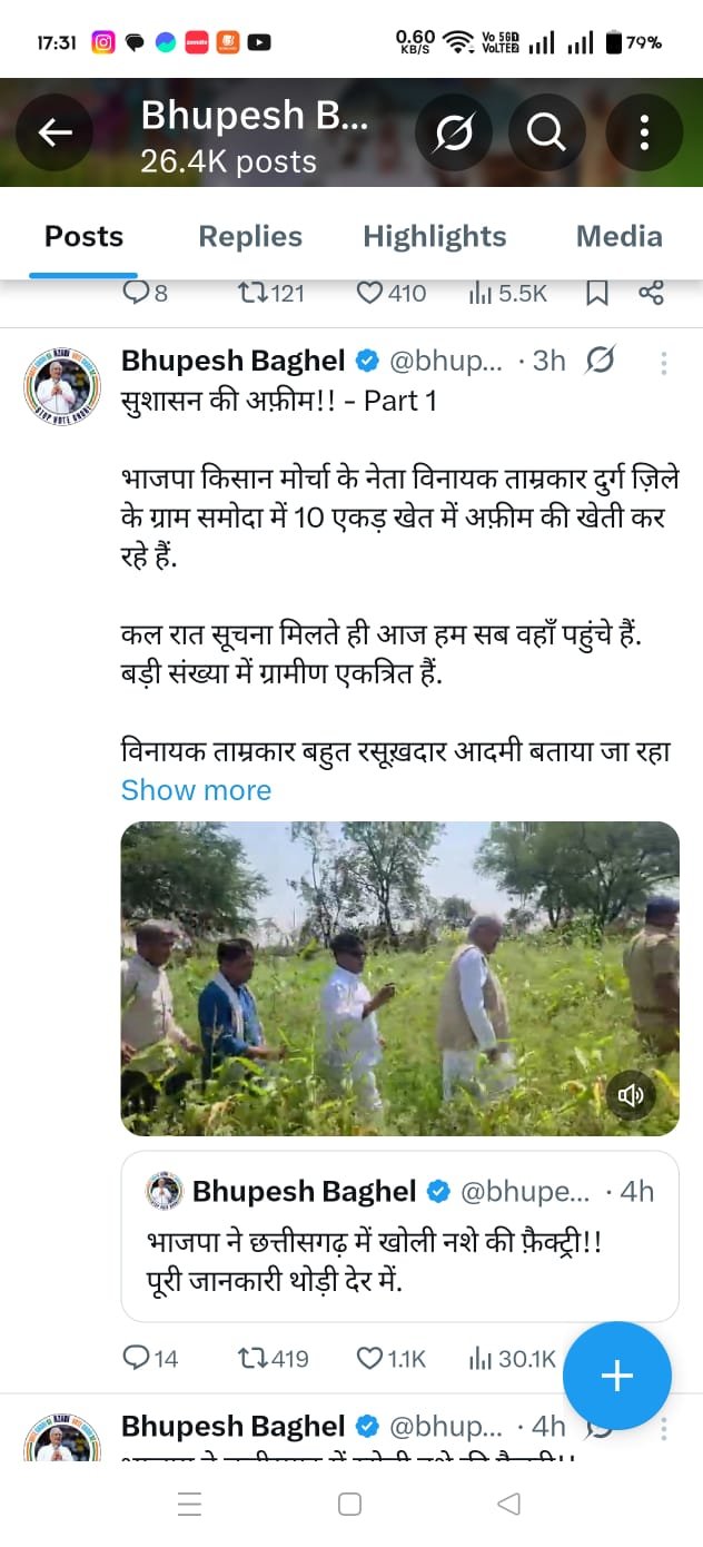 भूपेश बघेल ने अपने पहले ट्वीट में कहा कि समोदा गांव में 10 एकड़ खेत में अफीम की खेती हो रही है। उन्होंने बताया कि विनायक ताम्रकार बड़े रसूख़दार नेता हैं और उनका उठना-बैठना बड़े अधिकारियों और मंत्रियों के साथ है। उन्होंने सवाल किया कि यह प्रोजेक्ट भाजपा किसान मोर्चा का है या मंत्रियों का।