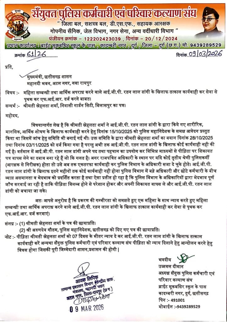 पीड़िता का आरोप है कि उन्होंने 15 अक्टूबर 2025 को पुलिस महानिदेशक, छत्तीसगढ़ (DGP) को लिखित रूप से शारीरिक, मानसिक और आर्थिक शोषण के संबंध में स्वयं उपस्थित होकर शिकायत प्रस्तुत की थी। प्रस्तुत शिकायत के बाद जांच के लिए एक विशेष समिति भी गठित की गई थी, जिसने 28 अक्टूबर और 3 नवंबर 2025 को पीडिता का बयान दर्ज किया था। पीड़िता के अनुसार इसके बावजूद आज तक कोई ठोस कार्यवाही नहीं हुई है।