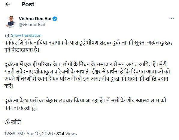 मुख्यमंत्री विष्णु देव साय ने हादसे पर गहरा दुख व्यक्त किया है। उन्होंने कहा कि इस दुर्घटना की सूचना अत्यंत दुःखद और पीड़ादायक है। एक ही परिवार के छह सदस्यों के निधन से वे अत्यंत व्यथित हैं।