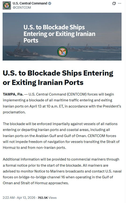 अमेरिकी केंद्रीय कमान United States Central Command (CENTCOM) ने घोषणा की है कि नाकेबंदी आज सुबह 10 बजे (ईस्टर्न टाइम) से प्रभावी होगी। इसके तहत ईरानी बंदरगाहों में प्रवेश करने या वहां से निकलने वाले सभी जहाजों की आवाजाही रोकी जाएगी।